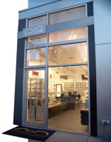 Local architect Alan Dunn of Dunn and Associates, Inc., was contracted to design the boutique. A bench on one side of the room and the eyewear display on the other allow shoppers visiting this avant-garde neighborhood to view the eyewear as art. "We kept it a museum-like environment in that it's a stark, white space with a dark slate tile floor," Dunn says. "The only use of color is that some of the translucent Plexiglas shelves are tin-ted red and blue, which kind of plays off the whole compositional character of the wall."