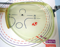 | Top to bottom: Checking the cutout potential and usable near area of a short corridor lens; showing the proper places to check progressive lenses; typical markings show how the progression is decentered within the blank; a cutout chart for one of the new wavefront designed lenses; this lens with a dot at the patent's pupil center will not process without cutout problems since the frame edge falls outside the largest concentric circle representing the largest possible blank |