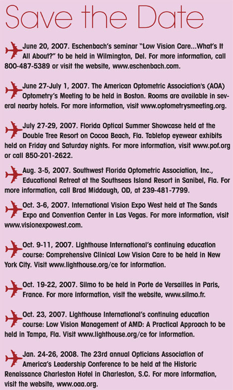 | The American Academy of Ophthalmology has promoted Donna Lock to executive director of the American Academy of Ophthalmic Executives (AAOE). In her new role, Lock will work with the AAOE board of directors to oversee strategic direction and will lead membership recruitment and retention initiatives. Eastern States Eyewear recently named Phil Cohen the new vice president of sales and marketing. Since joining the company in 1984, Cohen is one of only two people to win ESE's Ben Shyer award, a long-term achievement award. He has also received the company's Salesperson of the Year award. REM Eyewear has hired industry veteran Daniel Lai as the sales director for Asia. Lai will oversee the sales of REM's brands in 10 different countries. He has 17 years of experience in the optical industry, particularly in Asia. Shamir Insight has added Brandon Keller as an account executive. Keller joins the company from Holden Optical where he was an optician. In his role as account executive, he will cover California's Inland Empire and Reno, Nev. The company has also added Charles Murdoch as an account executive. He joins Shamir from Luxottica Group and will be covering the Jacksonville, Tampa, and Orlando, Fla., territories. Hydrogel Vision Corporation has hired Edward Lohmann as the company's new area sales director for the western U.S. Lohmann brings more than 30 years of experience in the contact lens industry. | ||