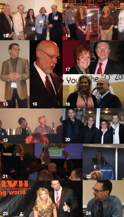 13. Essilor Vendor of the Year, EyeQ, receives a plaque. Shown (l to r): Larry Bell of EyeQ, Roy Popilek of Essilor, Cheryl O’Hearn of Sidney Love, Audrey Reed of Essilor, and John Love from EyeQ. 14. The Wiley-X team shows off their new Street Series collection. 15. Framescape’s Chris Maling discusses the company’s product and marketing expansion plans. 16. VCA’s Ed Greene (pictured) accepts his award at Eyes on New York. Jobson’s Marc Ferrara was also recognized. 17. James Day, OD, and wife Rosemary enjoy the Marchon/ Essilor party at Bowlmor Lanes downtown. 18. Steve Seibert, Three Rivers Optical (r), congratulates Julia Emery from Distinctive Vision in Round Rock, Texas (l), on winning the drawing for $10,000 in Transitions products. 19. Barbara McReynolds and Gai Gherardi of l.a. Eyeworks discuss the latest trends and tactics for success in the frame market at a panel consisting of Robert Marc’s Robert Marc, McReynolds and Gherardi, Beausoleil’s Frederic Beausoleil, and Sheila Vance of Sama Eyewear. The session was moderated by the president of the Accessories Council, Karen Giberson. 20. (l to r): Moritz Krueger, Igor Sinder, Luda Sinder, and Cedric Moreau step outside for a photo during the MYKITA party at Selima Optique. 21. Celebrating optical knowledge at the Essilor College Bowl. 22. David Friedfeld starts the evening at the UJA-Federation of New York Optical Division’s party, where Nationwide Vision Laser & Eye Centers’ Al Bernstein and the Robinson Family of B. Robinson Optical were recognized. |