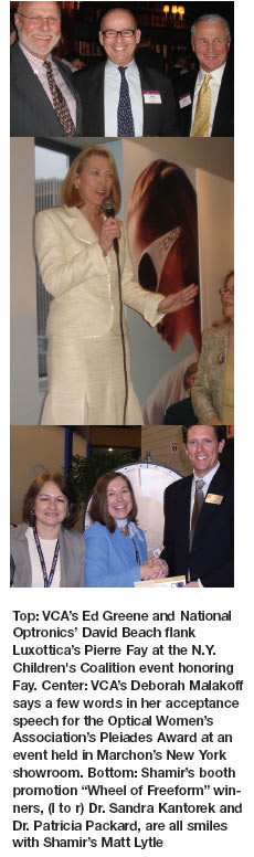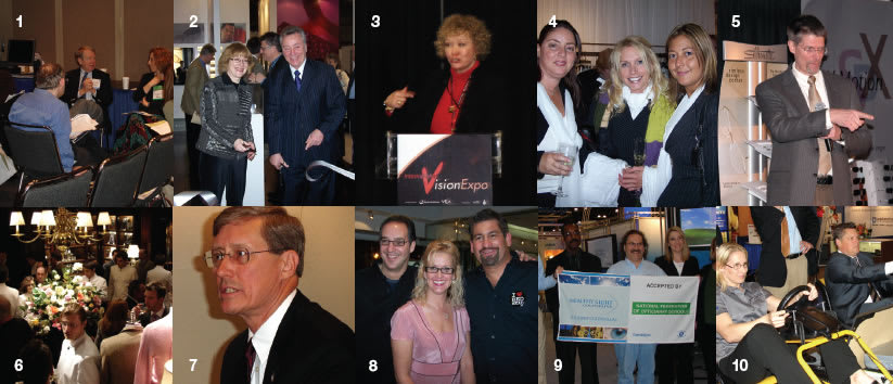 23. Ivanka Trump joins Revolution Eyewear’s Gary Martin at the company’s booth. 24. Eric Lindquist, Specialty Lens Corporation, at a pod cast addressing polarized lens topics during Vision Expo East; he was joined for the chat by Jennifer Jenson, Silhouette Optical. 25. Essilor’s Bob Colucci and wife Pam enjoy the Bowlmor Lanes party. 26. Revolution’s Gary Martin with football legend Michael Strahan. 27. Rapper Ludacris also stopped by the Revolution booth. 28. Oakley’s rolling lab rolled inside the convention center to demonstrate eyewear safety and protection to attendees. 29. Latin pop star Thalia makes an appearance at the Kenmark Group booth. 30. Partygoers enjoy the Serengeti booth fete. 31. Corinne and Tobi McCormack celebrate the launch of the Tobi Pac, an eyeglass case/carryall/backpack for dogs. A portion of canine case sales goes to Guiding Eyes for the Blind. 32. Celebrating the 20th Anniversary of Lafont in the U.S. are: Laurence Lafont (l) and Ray Khalil. 33. Optical Women’s Association members Carmen Renschler and Christie Walker announce their plans to participate in the 2007 Breast Cancer 3-Day Event. Shown: sponsor Transitions’ Susan Cashion with Walker. 34. (l to r): Steve Neussberger, John Carrier, and Carl Bracy from Essilor of America and Essilor Laboratories of America during a press breakfast. 35. (l to r): Charmant’s Dennis Davis, Harry Aida, Bill Ferraro, Jean Simone, Taketoshi Mizukami, Dee Berghuys, Satoshi Masutani, and Masakiyo Honjo gather together to celebrate the company’s new booth. |
