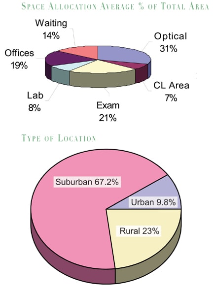 | While the charts at the bottom of this page and the top of the next refer specifically to the location type, cost, revenue, and space allocation breakdowns of Cleinman Performance Partners, Inc.'s client base, they could mirror what the optical industry looks like. Of note is that in terms of location type, the largest number of survey respondents (46.8 percent) were situated in freestanding locations, followed by strip centers (24.2 percent), and professional condos (12.9 percent). Source: Cleinman Performance Partners, Inc. 2005 Space Utilization Survey (results from client base in 23 U.S. states and Canada) |