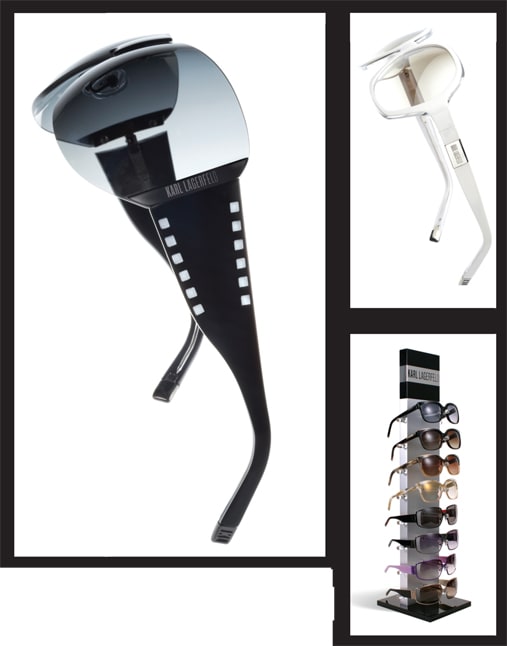 The new Karl Lagerfeld collection (shown clockwise from above): A filmstrip inspires sunwear, a sunglass with a clean contemporary look, one of the P.O.P. pieces offered