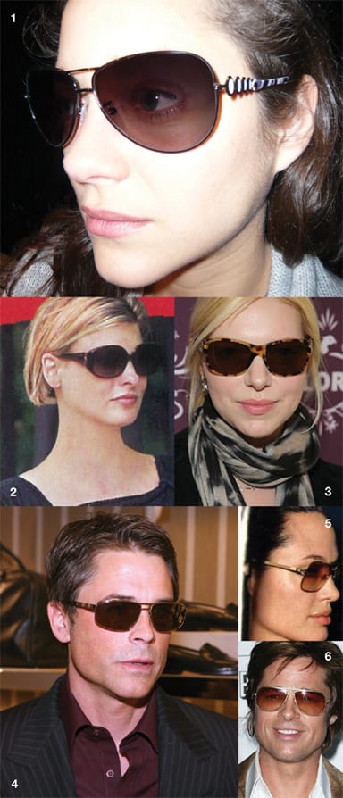 | 1. Oscar winner (best actress, "La Vie en Rose") Marion Cotillard's first major U.S. movie was Tim Burton's fantasy "Big Fish" in 2003. Since her award-winning turn as French singer Edith Piaf, the Parisian native and Greenpeace spokesperson has been on a glamorous circuit and most recently sported Emilio Pucci style EP1055 from Marchon during a visit to the United States for the Academy Awards. 2. Linda Evangelistais best known as one of the original supermodels, but she's also involved in humanitarian efforts to raise AIDS and breast cancer awareness. Her style quotient is still as high as her profile: She was recently spotted taking a stroll in New York City wearing Christian Roth style 14267 from Charmant. 3. New Jersey native Laura Prepon gained fame playing Donna Pinciottti on "That 70s Show" and currently stars on ABC's "October Road." Prepon shows off Dolce & Gabbana DG4025 from the Ilori suite by Luxottica at the Screen Actors Guild Awards. 4. "Brothers and Sisters" star Rob Lowe started acting at the tender age of eight in a community theater in Ohio. In high school he appeared in movies made by two famous classmates, Charlie Sheen and Sean Penn. Here, Lowe wears Cole Haan CH674 from ClearVision. 5-6. Oklahoma-born actor Brad Pitt has added movie producing to his repertoire—he served as a producer for A Mighty Heart in 2007 and The Departed in 2006. Juggling motherhood, goodwill work, and acting, Mrs. Pitt, Angelina Jolie, is no slacker either. These days they are so in sync that they sometimes wear the same style eyewear. Both were seen sporting Rolf Goldline Grad by Mykita. |