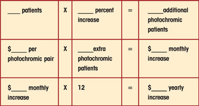 | Industry surveys indicate photochromics comprise roughly 16 percent of a typical eyecare practice's total lens sales. If a practice increases that amount by 14 percent (for a total slice of 30 percent of sales), it will experience an annual increase of $16,320. D.I.Y.: Increase your photochromics by your target percent. How does this affect your revenue?