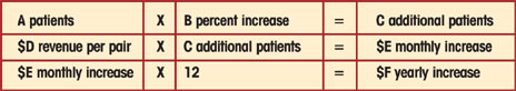 Industry averages indicate AR represents $60 of added revenue per sale. A practice that bumps AR from 26 percent to 40 percent of sales could experience a $12,240 jump in annual revenue. D.I.Y.: Increase your AR by your target percent. How does this affect your revenue/month? ![]() |