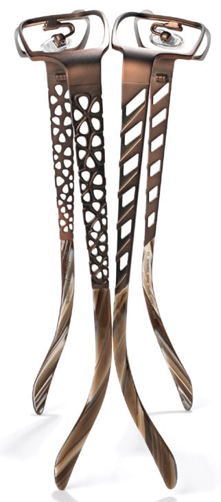 1 ProDesign has introduced a series of new frames created by cutting layers of titanium. Three masculine shapes are represented with dynamic geometric carvings throughout the temple, while four feminine shapes show off carved flowers. Both the male and female styles are available in four color options. For additional information, visit the company's website at www.prodesign-denmark.com.