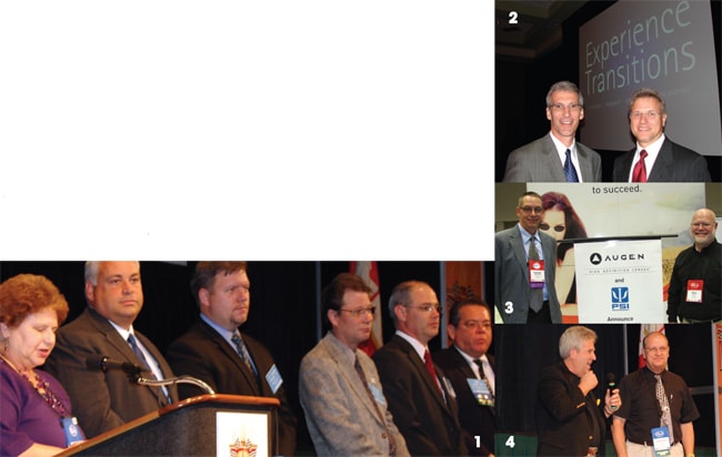 1. Corrine Hood (l) inducts new OLA officers (l to r) Barney Dougher, J. Larry Enright, Kevin Bargman, Jonathan Jacobs, and Ed Dietz; 2. Dave Cole (l) and John Ligas introduce Transitions VI. 3. Pat Hernandez, PSI (l) and Richard Kapash, Augen Optics, launch the exclusive Augen U.S. distributorship with PSI. 4. At "Done!—Stop Talking, Stop Waiting and Start Doing!"general session leader Barry Wishner (l), asks Larry Lahr (r), 51-year optical veteran and executive vice president of Eye-Kraft Optical lab, about industry changes