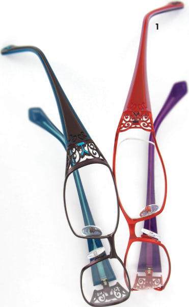 | ProDesign's new collection sprang from the desire to create bold effects by cutting into layers of titanium. Company representatives note that the exclusive collection with a beautiful color play mirrors the graphic ProDesign look. The collection can roughly be split into two series. A masculine series with dynamic and graphic carvings throughout the temples is available in two classic shapes and one sportier style. They come in four deep and rich colors, which combine with the stylish cuttings and exclusivity to add roughness to the look. As a contrast, ProDesign presents a series for women with carved graphic flowers throughout the temples. In order to create a not-too-feminine look, the pattern is more graphic in its expression than the ornaments familiar from the Iris series. Three exclusive basic colors recur in all four models, and they are supplemented by feminine colors such as red, purple, matt gold, and olive green. It is available in four models, including a semi-rimless one that comes with a nylon bottom. Call 800-654-6099 or go to www.prodesigndenmark.com. |
