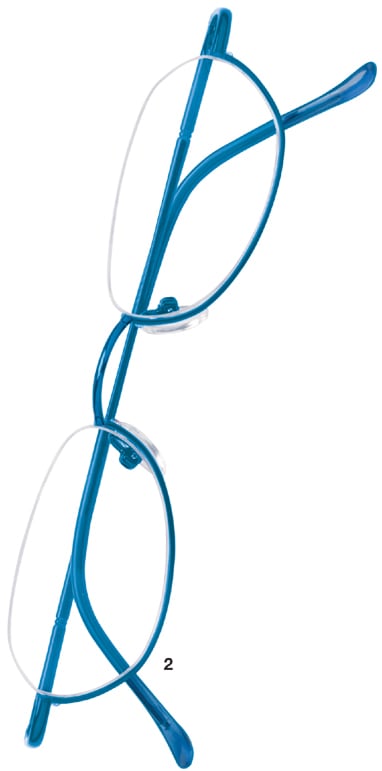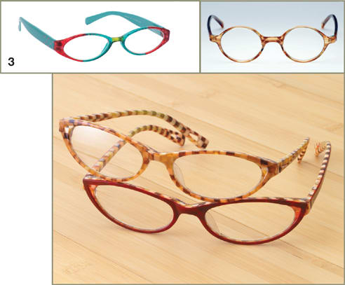 | 1. Cinzia's Irreverent in purple metal lends a contemporary twist with its bold color and temple design: www.cinziadesigns.com, 800-701-6765; 2. A twist on semi-rimless, with the rim on the bottom, plus a pop of color, make California Accessories' Bistro in blueberry stand out: www.calaccessories.com, 800-523-5567; 3. Hilco serves up some multicolor fun with its painted style, HP301: www.hilco-usa.com, 800-955-6544; 4. The retro look is made soft and feminine on Amy Sacks style Diane in taffy: www.amysacks.com, 877-274-0410; 5. Corinne McCormack livens things up with a fun pattern in pretty shades of red and brown in the Checkerboard style: www.corinnemccormack.com, 212-868-7919. |