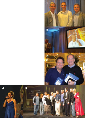 1. Catching up and moving forward, (l to r) Transitions’ Dave Cole, Brian Hauser, and John Ligas at Transitions Academy; 2. Cole introduces XTRActive, the newest development in the Transitions family of lenses; 3. Stuart Kosh of VSP Ultra Lens Laboratory greets Richard Rubin, LDO, of the The Eye Center, Pembroke Pines, Fla.; 4. The Lab of the Year evening celebration kicks off with inspiring vocalists; 5. Winchester Optical celebrates its win as this year's Transitions’ Lab of the Year |