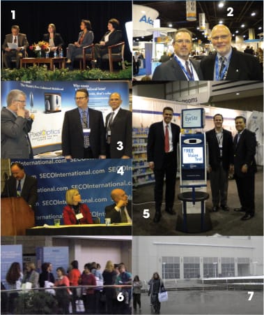| 1. Moderator Neil Gailmard, OD, (l) presents Know Your Patients, Grow Your Practice with (center, l to r) Ann Abel-Epstein, OD; Hilary Hawthorne, OD; and Shelly Ungar Toltz, OD; 2. The Vision Council's Mike Daley (l) and Ed Greene walk the show floor; 3. (l to r) Penn Moody, OD, of Moody Eyes in Indianapolis, Ind., with PixelOptics' Clay Musslewhite and John Ditski; 4. Reviewing data at CIBA's Shared Passion for Healthy Vision and Better Life Media Briefing are CIBA Vision's (l to r) Rick Weisbarth, OD; Jan Wagner; and Francesco Balestrieri; 5. At the SoloHealth press conference to announce the next generation of vision screening kiosks are (l to r) Bart Foster; Stephen Kendig; and Tony Sommer; 6. and 7. Attendees brave snow to get to SECO International events |