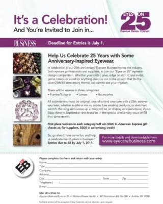 Entries are due to EB by July 1, 2011. For more details and a downloadable entry form, visit the EB website: EyecareBusiness.com.