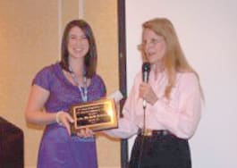 Katie Robertson (l) accepts the Dr. Harvey Yamamoto Award from Dr. Pam Miller, AOS president (r)