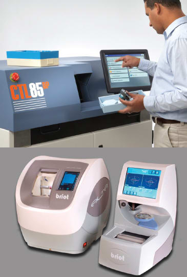 Top to bottom: Mr. Blue from Essilor Instruments, National Optronics' Axiom, Leybold's small footprint lab layout, Optical Dynamics' nanoCLEAR AR 5.1