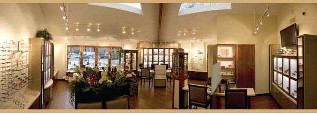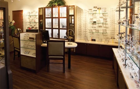 Sleek acrylic frame bars and glass shelves make the newly redesigned space feel more open. Above: Terry Foster, OD, and Randal Cox, OD