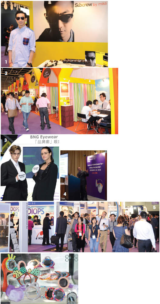 | 1. Sam Lee, who founded the Subcrew street fashion brand in 2003, is center stage for the launch of “Subcrew by Mikli”; 2. High-end names abound in a colorful village atmosphere; 3. Models showcase the latest designs from the Brand Name Gallery; 4. The Vision Council's Jamie Shyer presents “A Global Eyewear Tour”; 5. Premium Korea was among the many wellattended country pavilions; 6. The winner of the 13th Hong Kong Eyewear Design Competition in the Individual Group was Show-Big, designed by Lai Pui Yan |