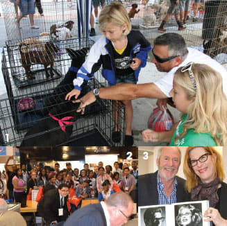 1. Attendees check out a few of the dogs available for adoption during the Kaenon Sup for a Pup event; 2. George Westinghouse High School students pose for a group photo at the 2012 International Vision Expo East; 3. Photographer Greg Gorman (l) with performer Justin Vivian Bond (r) at the l.a.Eyeworks book signing event |