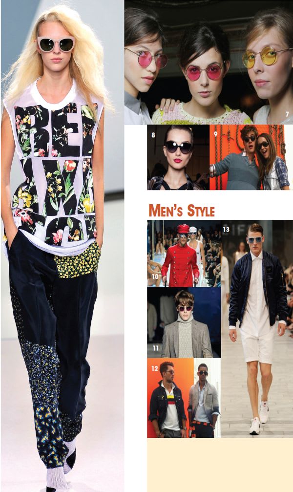 ■ Color in lenses. Vibrant hues and subtle shading enhance simple and classic shapes, especially red tones and blue shades. The mirror trend also continues into spring 2013.