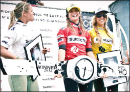 Kaenon's Courtney Conlogue on the winner's podium at the ASP 6-Star Swatch Girls Pro France