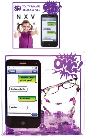 These younger patients are major communicators. Everything they say is abbreviated and often in acronyms, so have fun and be creative, as in the sample displays (shown left)—with your windows, vitrines, and fixtures that are geared to the youth market. EB