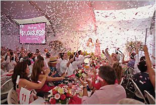 Vera Bradley co-founders Barbara Bradley Baekgaard and Patricia Miller, mourning the loss of a dear friend to breast cancer, started the event in 1994. “We knew for the sake of our daughters and granddaughters we needed to do something impactful to try to find a cure and spread hope,“ says Baekgaard. The four-day event, held May 30 through June 2, included tennis, nine- and 18-hole golf scrambles, and social events with close to 2,000 people—players, volunteers, and supporters—showing their support and commitment to the cause. The culmination was a celebration dinner under a tent at Sycamore Hills Golf Club with more than 900 guests that concluded with a video message from Bryan Schneider, M.D., the Vera Bradley Investigator. The program ended on a high note with the Classic’s own rendition of a Pharrell Williams’ “Happy”-themed dance video and a shower of pink and white confetti when the amount raised was revealed.
