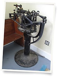 Recognize this? Probably not. This is a Diopto-Eikonometer from American Optical, circa 1949. It measured the magnification power of prescription lenses, as well as the “effectivity, prism power, oblique power errors, and distortion of the lenses to a high degree of accuracy,” according to a 1949 AO article about it. It is one of the many artifacts of The Optical Heritage Museum in Southbridge, MA, and is on loan to neighboring optical instrument company Optimum Technologies, where the 300-pound device is on display in the lobby.