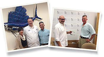 Costa hosted the optical press for a day of sunwear immersion as representatives gave tours, talked sun lens technology, and shared stories of the company’s mission. Left (l to r): PR rep Liza Jones, Rx manager Ed Sowers, and director of Rx sales Renato Cappuccitti. Right (l to r): designer Aaron Markovitz and vice president of product development Ed Moody discuss trends and technology.