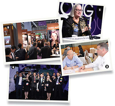 1. Eyecare Business’ Steph De Long talks market trends; 2. Attendees flock to the Italian Pavilion; 3. Rochester Optical’s Patrick Ho, left, and Tim Moore; 4. Manufacturing execs share a toast
