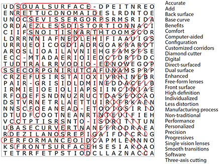 Dispensing children’s eyewear can be a challenging yet rewarding experience. It’s important to first consider the prescription—and the safety of the child—before making final frame and lens decisions. Likewise, it’s a good idea to talk to parents about having a backup pair of glasses, especially if the lens power is significant. Try to find all of the terms in this puzzle related to fitting children with corrective eyewear.