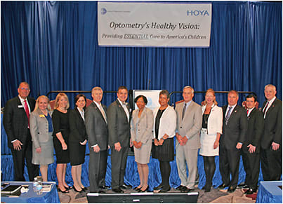 PUSHING FOR LEGISLATION that benefits national eye health issues, more than 300 American Optometric Association (AOA) delegates convened in Washington, DC, for the annual Congressional Advocacy Conference and met with legislators from around the country. A conference highlight was “Optometry’s Healthy Vision: The First 100 Days of Essential Pediatric Eye Health Coverage,” sponsored by HOYA Vision Care, a special summit on the new pediatric essential eye health benefit which launched earlier this year. Shown above are members of the AOA Board of Trustees with some of the speakers at the summit.