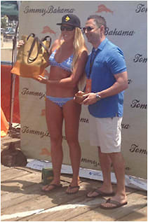 Tommy Bahama marketing director Eric Karp awards the first set of paddleboard winners at the Santa Monica Pier Paddleboard Race.