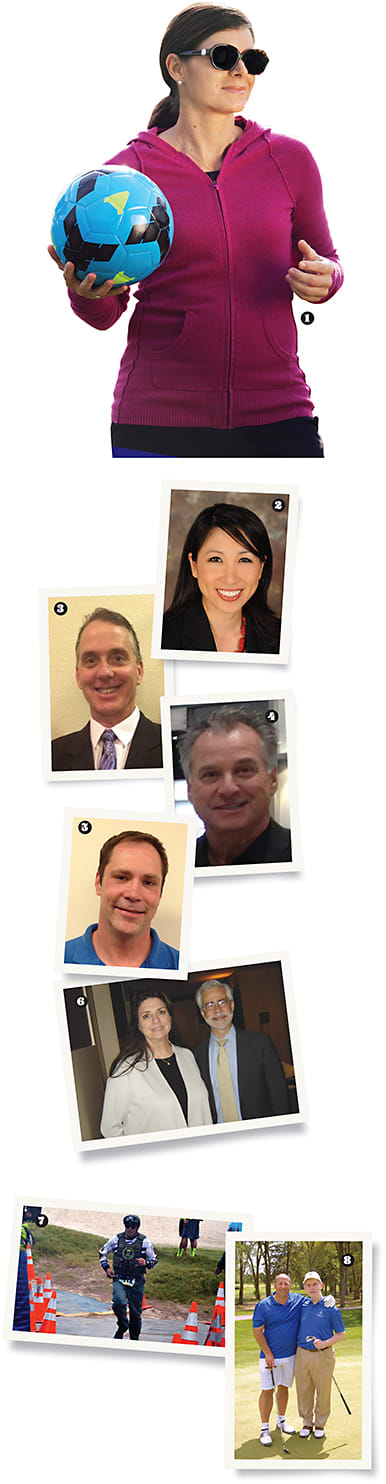 1. U.S. soccer star Mia Hamm is the new sponsor of Coppertone Polarized sun lenses, distributed by Vision-Ease Lens; 2. Charissa Lee, O.D., Johnson & Johnson Vision Care, Inc., North America; 3, 4, & 5. The McGee Group’s Charles Lee, Joe Cipriano, and Dave Martens; 6. Essilor of America’s Danne Ventura (l) with State University of New York (SUNY) College of Optometry president David Heath 7. Rudy Project has pledged its support of FBI Special Agent Edward Ignacio as he races to help build a Law Enforcement Memorial in the only state without one: Hawaii; 8. Envision CEO Michael Monteferrante with David Meador, past-president and current national champion of the United States Blind Golf Association