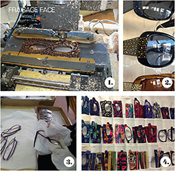 An average day at Fabrice Poncet’s Creations Poncet factory in Oyonnax, France, includes: 1. Cutting frame fronts; 2. Highly detailed frames with crystals and beads; 3. Hand-polishing finished products; 4. Offering a wide variety of material patterns and frame shapes