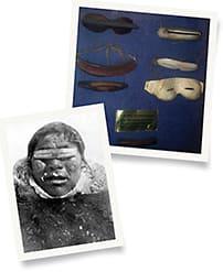 Above, artifacts are displayed on the museum wall; left, a native Eskimo protects his eyes from the snow