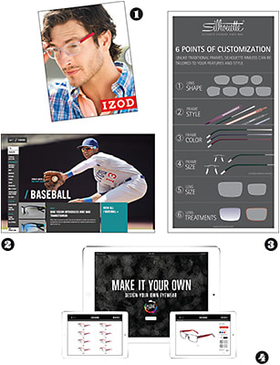 1. Izod’s personalization program P.O.P.; 2. Nikevision’s sport-specific eyewear interactive shopping guide with Marchon; 3. Silhouette walks patients through customization with a banner; 4. REM’s Converse customization site