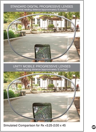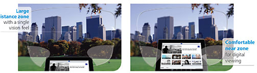 The lenses are optimized for the shorter near-viewing distance that mobile users need for regular mobile device use. They offer increased visual acuity and reduced eye fatigue for overall improved visual comfort without compromising the rest of the prescription.
