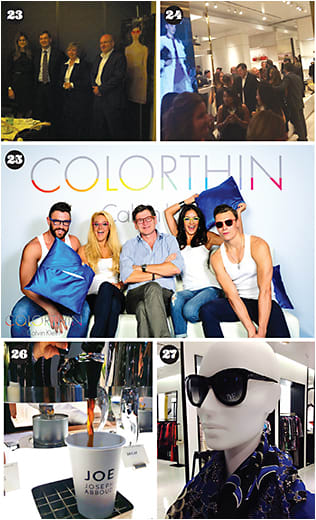23. Silhouette celebrates its 50th anniversary and new management team during a luncheon with (l to r) Kristen McLaughlin, Daniel Rogger, Jan Cory, and Heinz Pichler; 24. Marchon’s team and friends mixed and mingled at a Chloe in-store event; 25. The Party by Marchon at the Paris Hotel features stations for may of the company’s brands; Claudio Gottardi (center) stops by Calvin Klein’s ColorThin space for a visit; 26. Guests were welcome at Altair’s several booth events, toasting Altair’s collection of house brands at Altair’s House Party and sharing steaming hot cups of JOE every morning; 27. Fashion is the focus at a reception hosted by Marchon at the DVF store in the Caesars Palace Forum Shoppes