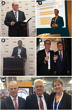 6. Jeff LaPlante of PFO Global at a press conference announcing the company’s latest lens and equipment launches; 7. The Vision Council’s Shawn Shafer leads a presentation about the State of the Industry, featuring the latest research from the Council; 8. Anthony Roberts announces the new Rx frame styles launched at the show by Babiators; 9. Shamir’s Raanan Naftalovich (l) and Mark Becker present several new initiatives at a press luncheon, including Shamir Spark, Shamir Arch, and the Shamir X3 fashion sun lens program; 10. Signet Armorlite’s Brad Staley and Lynne Roberts flank Crossbow Optical, Ltd.’s Mervyn McCrea at the Signet Armorlite booth. The two companies are expanding their relationship and offering house brand opportunities to ECPs