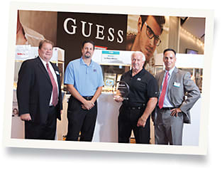 10. Dominique Jara (l) and Tina Lahti (r) of Vision-Ease Lens flank (l to r) United Healthcare’s Marc Van Camp, Gregory Hibbard, and Michael Keating at a reception hosted by Spectera and Vision-Ease; 11. (l to r) Larry Clarke, John Fried, Virginia “Susie” Lesher, Michael B. Brown, Jerry Mansuy, Matt Iovaldi, and Jim Roussel are honored at The Vision Council Optical Lab Division’s Hall of Fame Awards Banquet (missing are Mike Dougher and Frank Giammanco); 12. Ed Greene, recently retired from The Vision Council, accepts The Optical Lab Division’s Director’s Choice Award from Virginia “Susie” Lesher; 13. Henry (l) and James Shyer flank music producer Randy Jackson at Zyloware’s booth and meet customers;