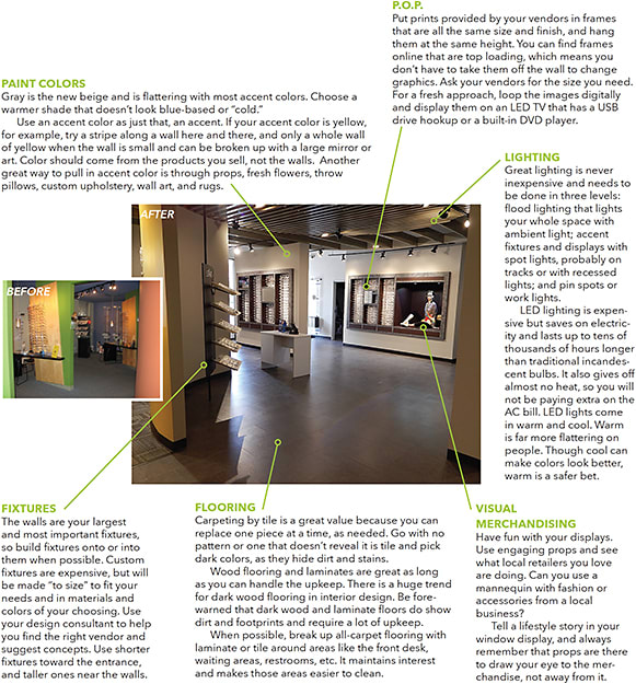 • VISUAL MERCHANDISING: If your design consultant does not do your displays, ask them to find a visual merchandiser. The worst thing you can do is to create a beautiful new space and then not have displays of equal caliber. A visual merchandiser can create displays—in windows and vitrines, on wall shelves, counters, and tabletops—and even hang marketing materials and vinyl graphics. Visual merchandisers will work for an hourly fee or a flat rate per project.