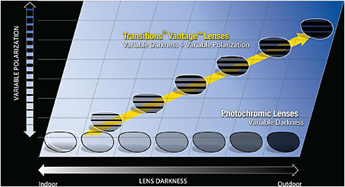 Transitions Vantage lenses are a technological breakthrough because they are the only photochromic lenses that polarize as they darken. Outdoors, the polarization adjusts to match the level of outdoor glare, which can vary as the day progresses and conditions change.