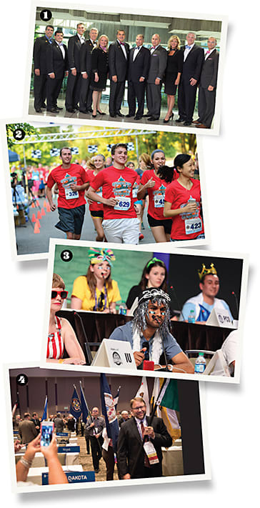 1. The AOA Board of Trustees, all wearing bow ties in honor of AOA president Steven Loomis (l-r): James P. DeVleming, O.D., Gregory A. Caldwell, O.D., Robert C. Layman, O.D., David A. Cockrell, O.D., Andrea P. Thau, O.D., Steven A. Loomis, O.D., Christopher J. Quinn, O.D., Samuel D. Pierce, O.D., Barbara L. Horn, O.D., William T. Reynolds, O.D., and Ronald L. Benner, O.D.; 2. AOA members support a great cause at the 2015 Optometry Cares 5K Run/Walk sponsored by The Vision Council and Transitions Optical; 3. Schools and colleges of optometry battle to be the smartest, loudest, and most creative in the 24th Annual Varilux Optometry Student Bowl; 4. The House of Delegates begins its session on June 25