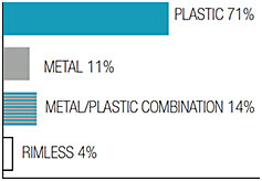 MATERIALS AND EXTRAS: In keeping with the national trend, polycarbonate is the most-used lens material here (cited as such by 55% of ECPs). However, that number is down from last year, most likely due to the increase in use of Trivex and high-index. Citation of plastic as the “go-to” material remained steady at 16%. Also remaining true to the national trend, AR tops the “extras” list here, with 80% of ECPs citing it as their most popular add-on. The South did better with sales of photochromics and polarized lenses as well. After losing 15% in sales from 2013 to 2014, photochromics has yet to regain its footing, though sales did gain 1 percentage point over last year’s dreary 10%. Polarized also saw a slight jump, up 3%.