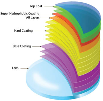 The scratch-resistant hard lacquer coat is underneath the AR stack coating. You might think it makes more sense to have the hard coating as the outermost layer to keep the lens from scratching. However, the hard lacquer coat is actually placed underneath the AR stack because anti-reflective thin films are brittle and ultra thin. Having the hard coat underneath the other layers acts as a supportive structure for the multi-layers of the AR stack (see sidebar, page 68).