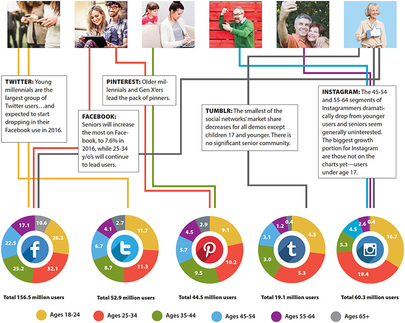 A recent report from eMarketer in Adweek shows that social media is going strong, but who is visiting and who is leaving Facebook, Twitter, Instagram, Pinterest, and Tumblr vary dramatically by age group.