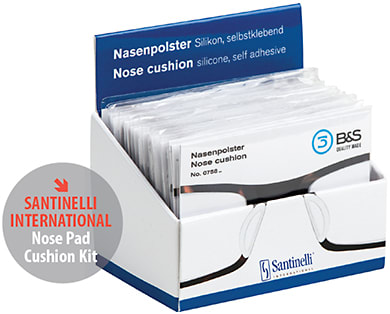 The Silicone Adhesive Nose Pad Cushion Kit from Santinelli International includes 30 pairs of individually wrapped cushions in three sizes: small, medium, and large. The cushions are neatly packaged in a self-contained point-of-purchase countertop display that keeps them highly visible for resale or available for complimentary customer “thank you” gifts.