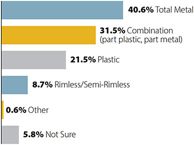 Which frame materials see the most sales? These statistics from The Vision Council VisionWatch Report (12-month sales as of December 2014) paint the picture of the most popular choices for eyeglass wearers.
