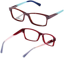The color theme of the temples is vivid and playful, and the split between the first two colors is easy to see, no matter how wearers style their hair. To balance the playful look of the temples, the front is monotone in the same color as the first color of the temple for a sophisticated, strong appearance. The grouping comes in four shapes and three to five colors, depending on the model.