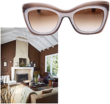 Blake Kuwahara sunglass (top); and a room with a view—Kuwahara’s living room in Sausalito, CA
